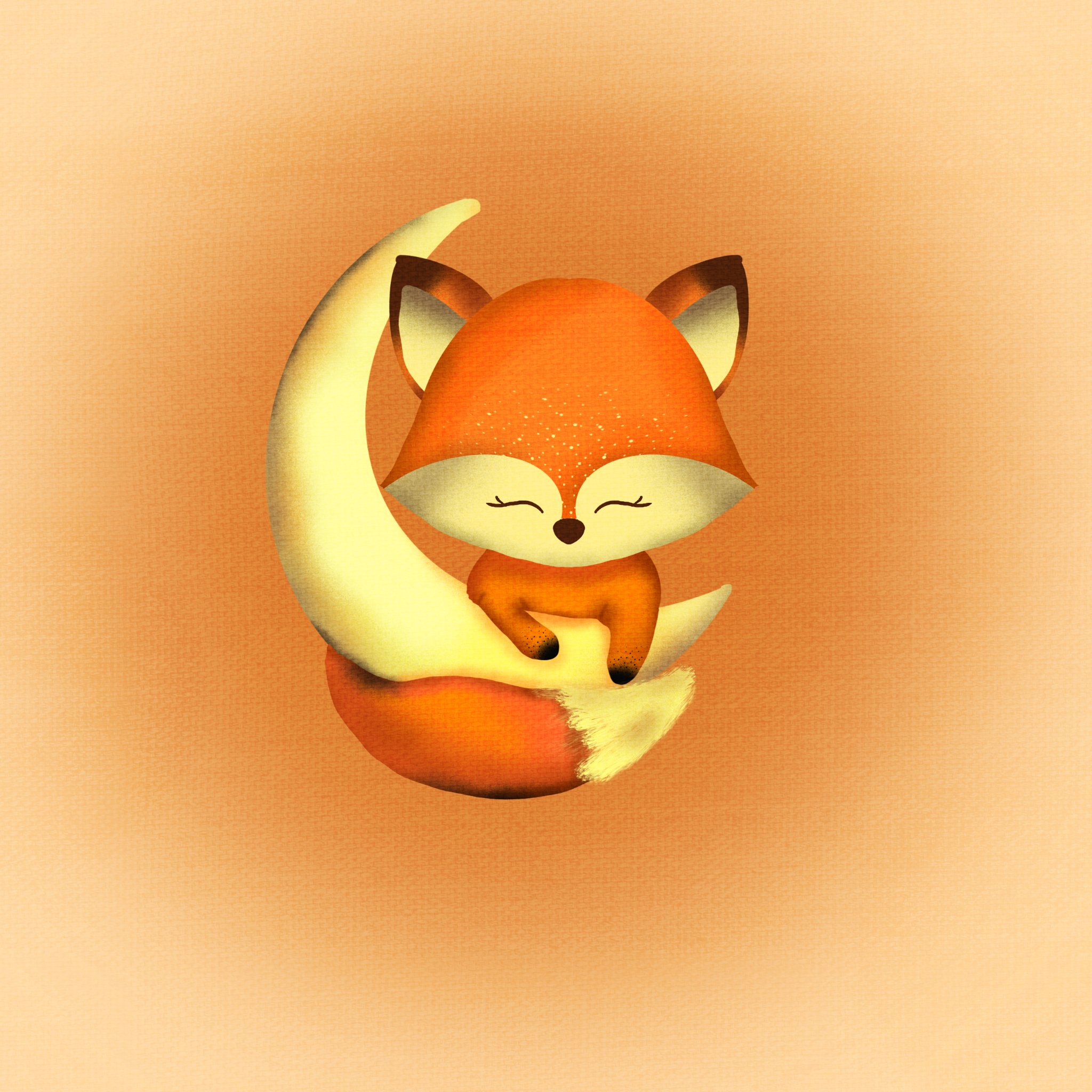 This digital illustration features a cute, stylized animal character in a peaceful, dreamlike pose, suitable for nursery art or a bedtime story. Subject: A small orange fox with large pointed...