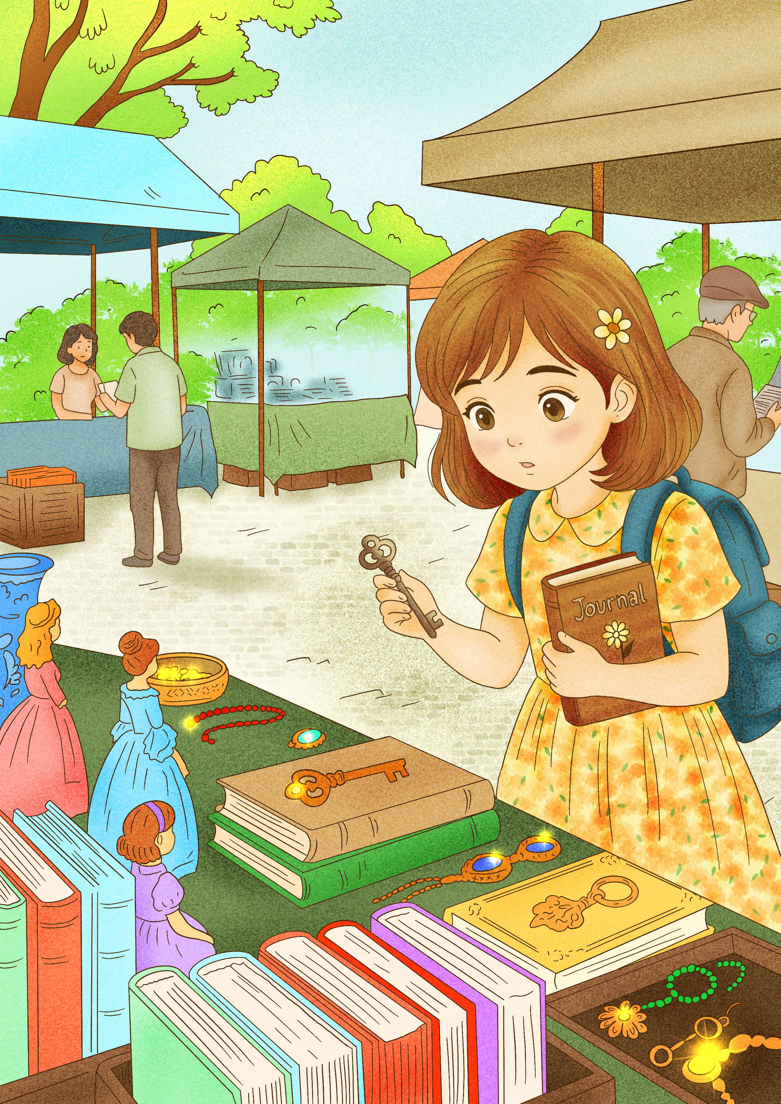 The Market’s Hidden MagicIn this vibrant narrative illustration, an ordinary trip to a bustling flea market transforms into the start of an adventure. The scene captures the precise moment of...
