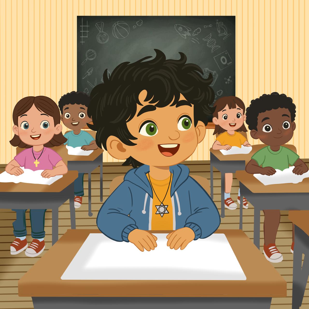 An expressive classroom scene centering on an enthusiastic student at his desk. It highlights diverse character design, relatable facial expressions, and a warm, inviting educational atmosphere ideal for school-based narratives.