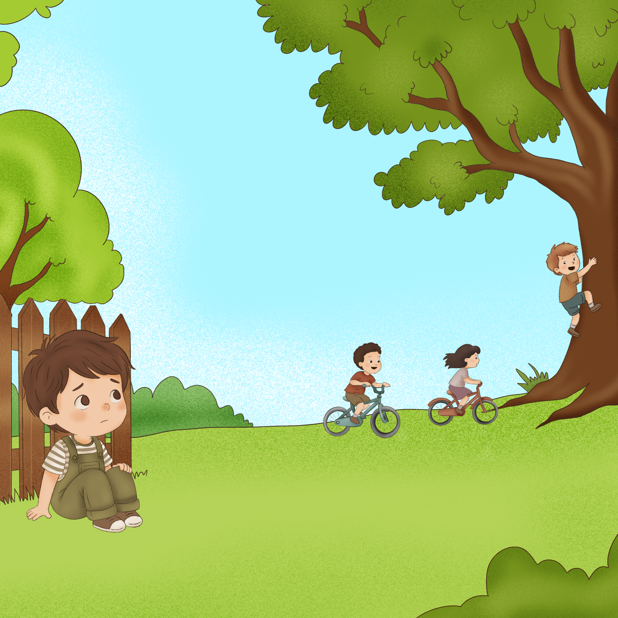This illustration captures a poignant moment of isolation as one child watches others play from a distance. Foreground Character: A young boy with brown hair sits on the grass, leaning...