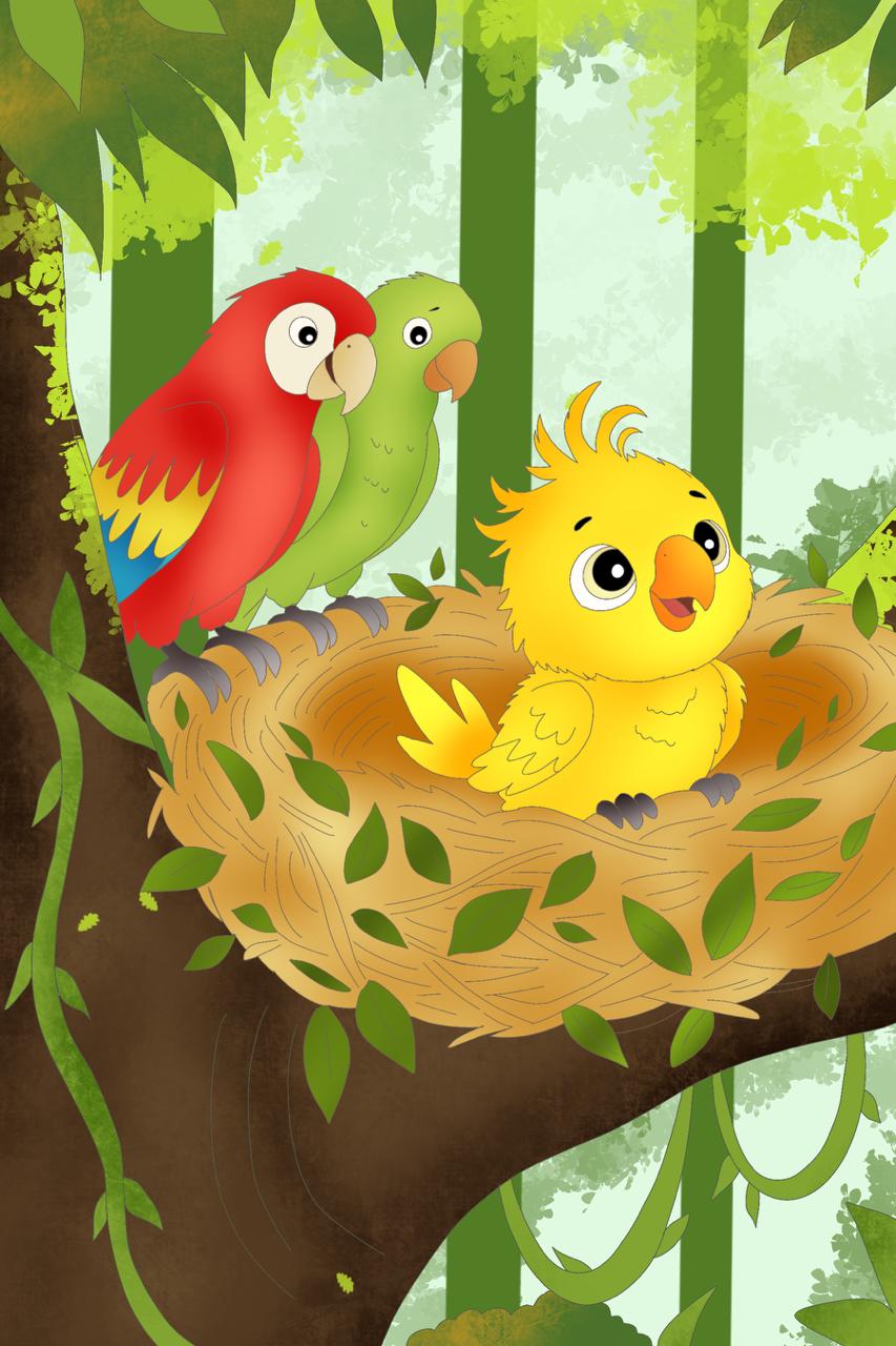 A sweet, colorful vignette showing a fluffy yellow chick safely in its nest, watched over by two bright parrots. This illustration demonstrates soft shading, vibrant tropical colors, and the ability...