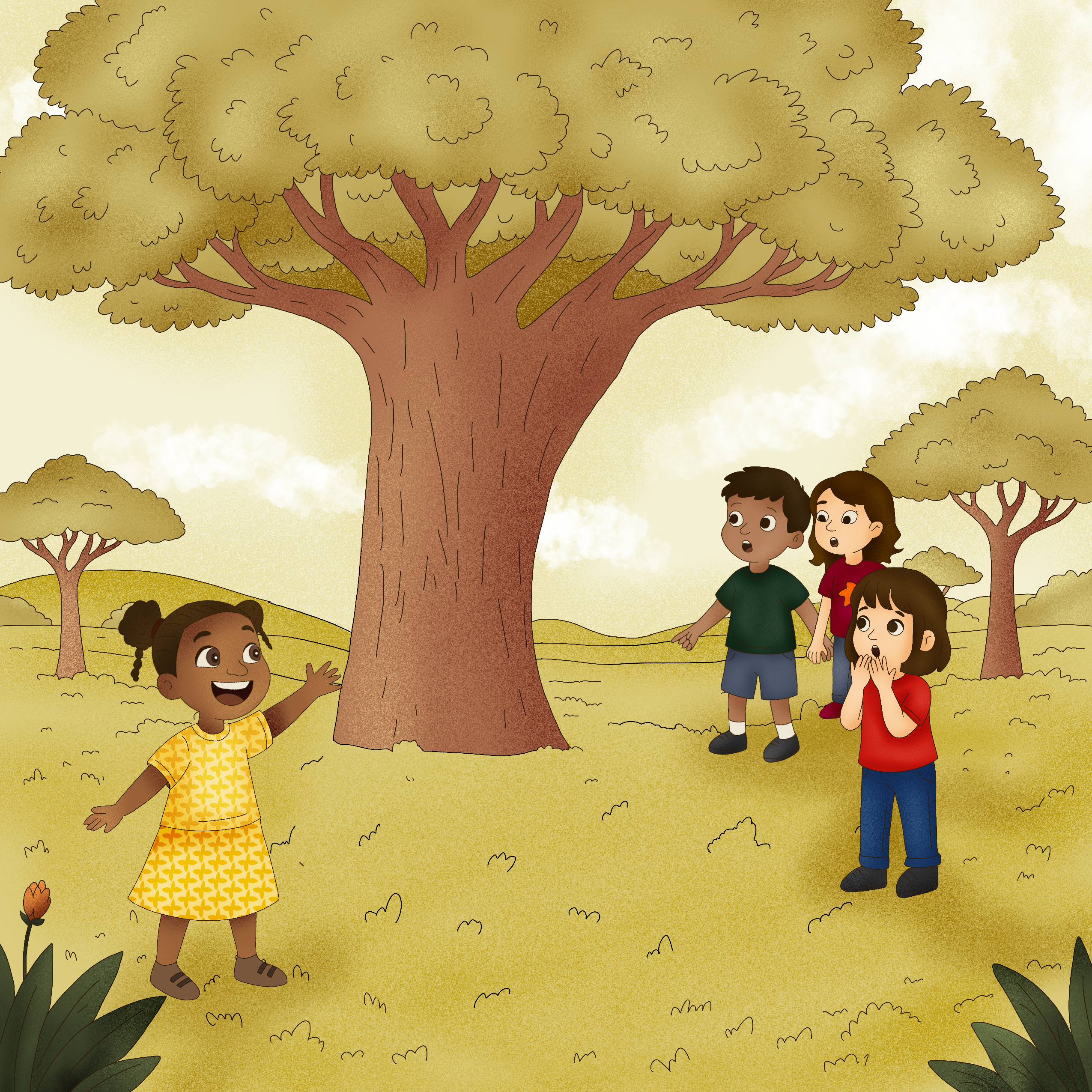 This digital illustration shows a scene of interaction and surprise among a group of children in a park or forest setting. Characters (Left): A young girl with dark skin and...