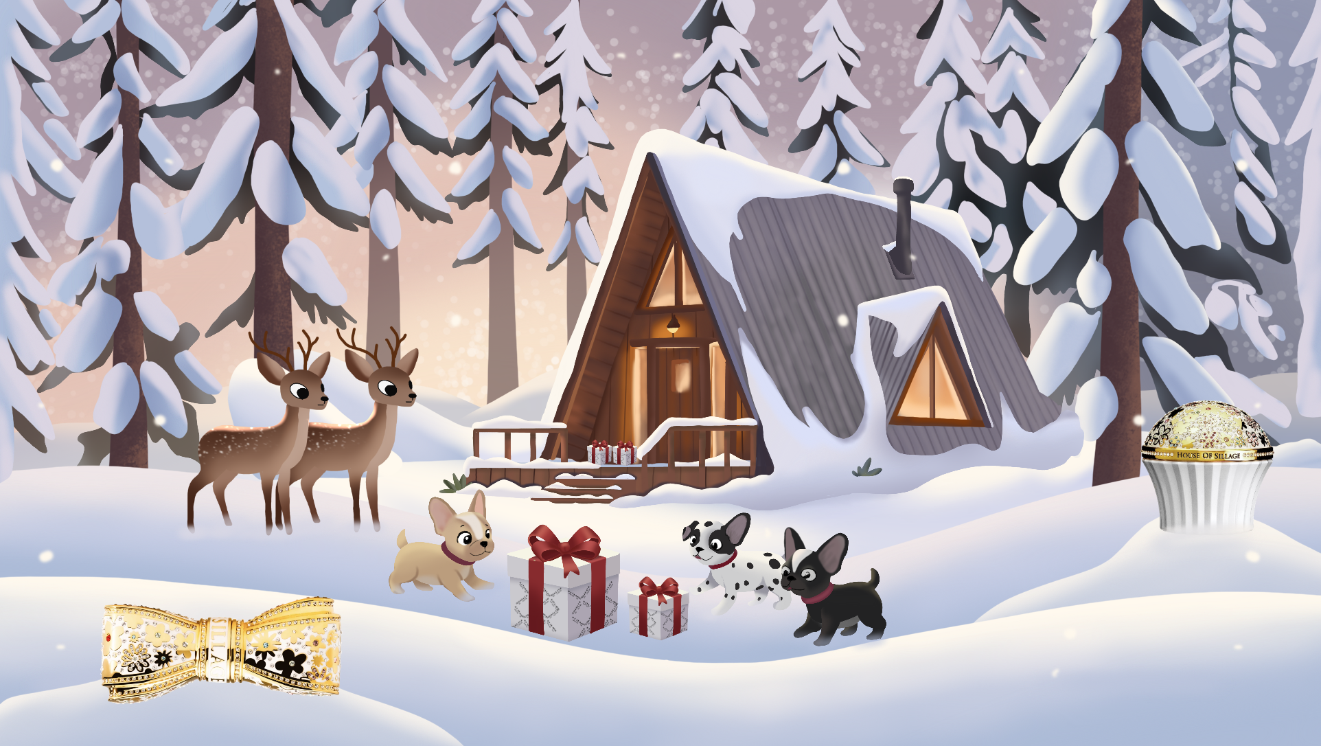 This illustration depicts a serene winter holiday scene featuring animals, a cozy shelter, and luxury objects. Setting: A cozy A-frame wooden cabin sits in the center, emitting a warm light...