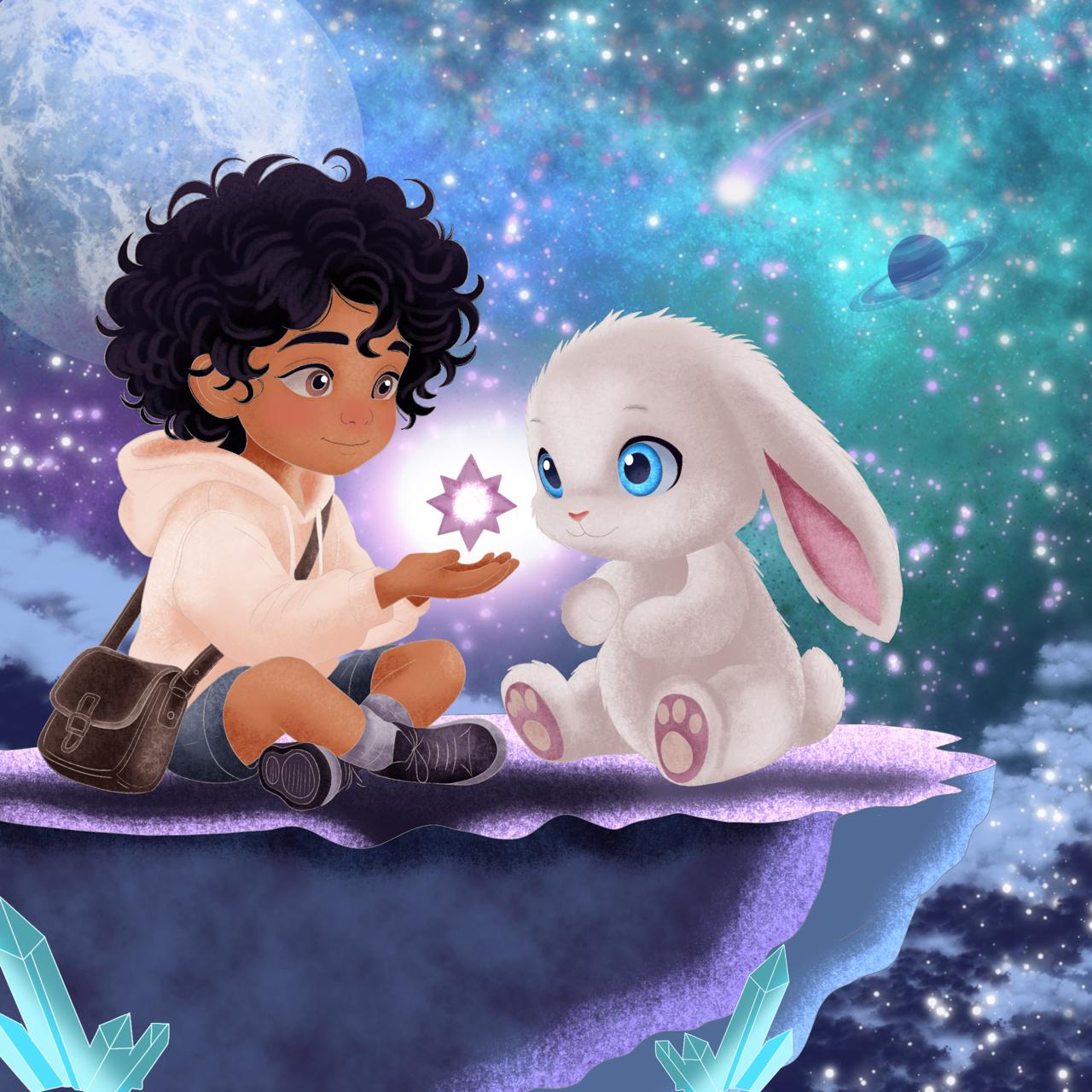 A dreamy, magical illustration of a child sharing a glowing star with a white bunny on a floating celestial island. It exhibits a rich, cosmic color palette, whimsical character design,...