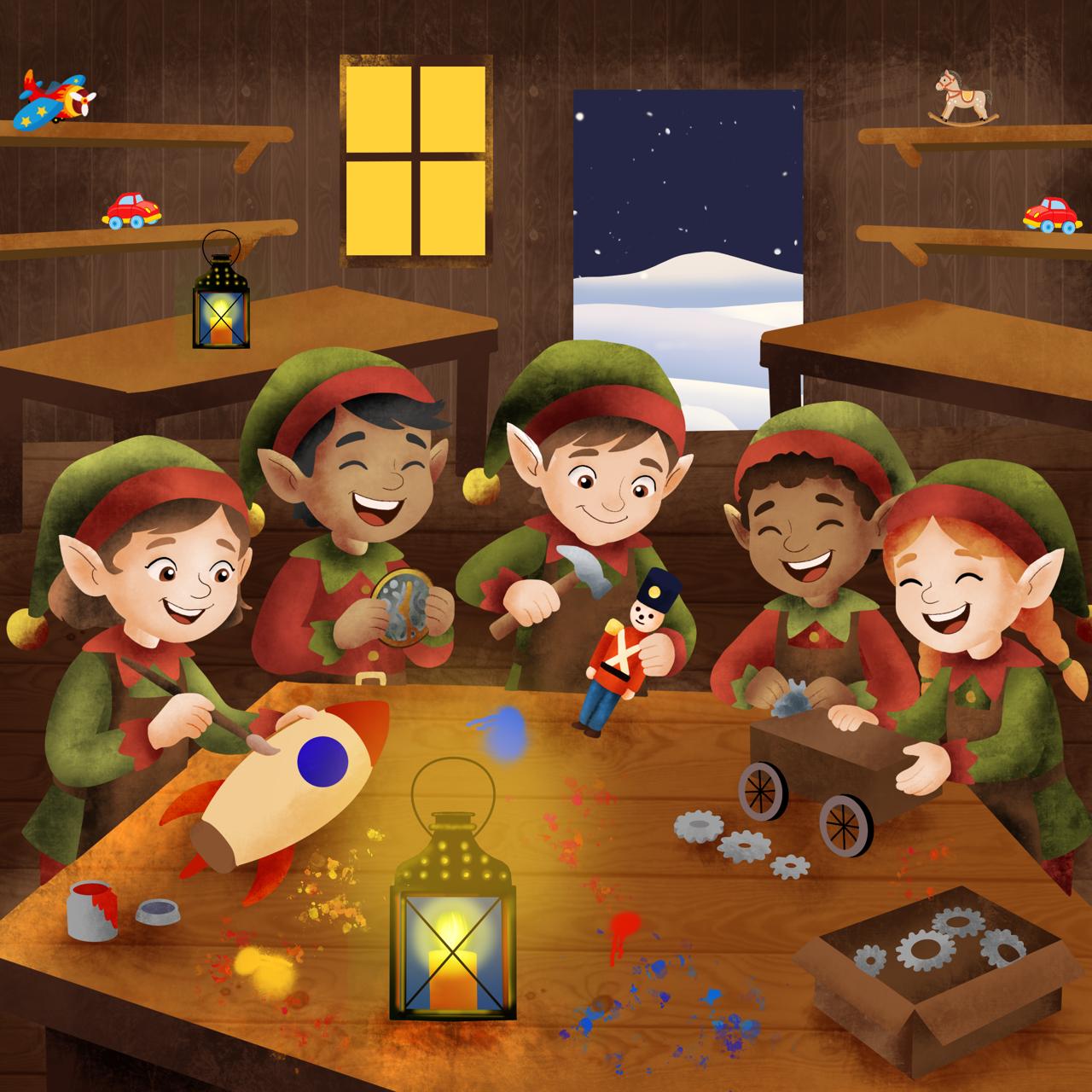 A festive, dynamic scene inside a busy workshop, featuring a group of happy elves collaborating to build and paint toys. This piece focuses on warm interior lighting, intricate background details,...