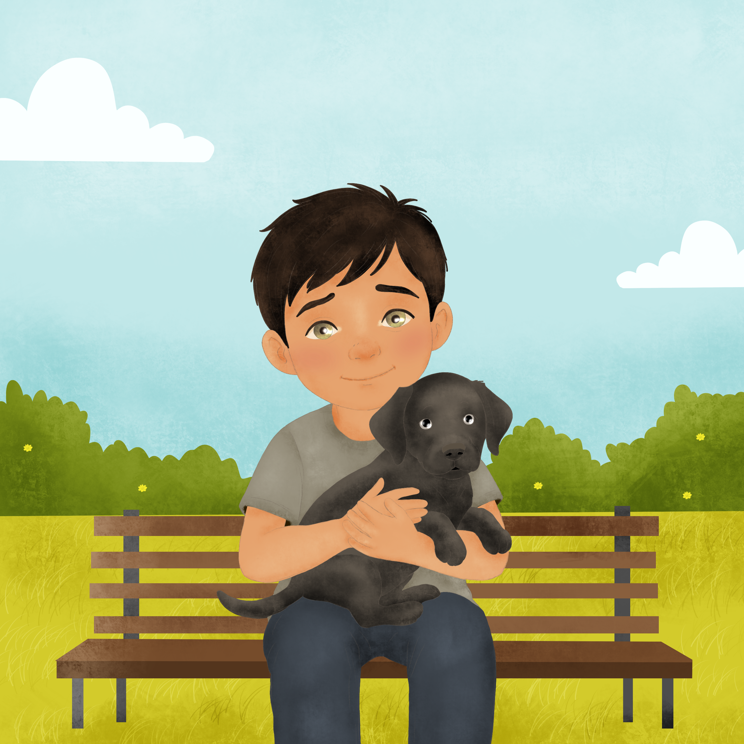 This illustration presents a sweet, quiet moment of bonding between a child and a pet in an outdoor setting. Subject: A young boy with short dark brown hair sits on...