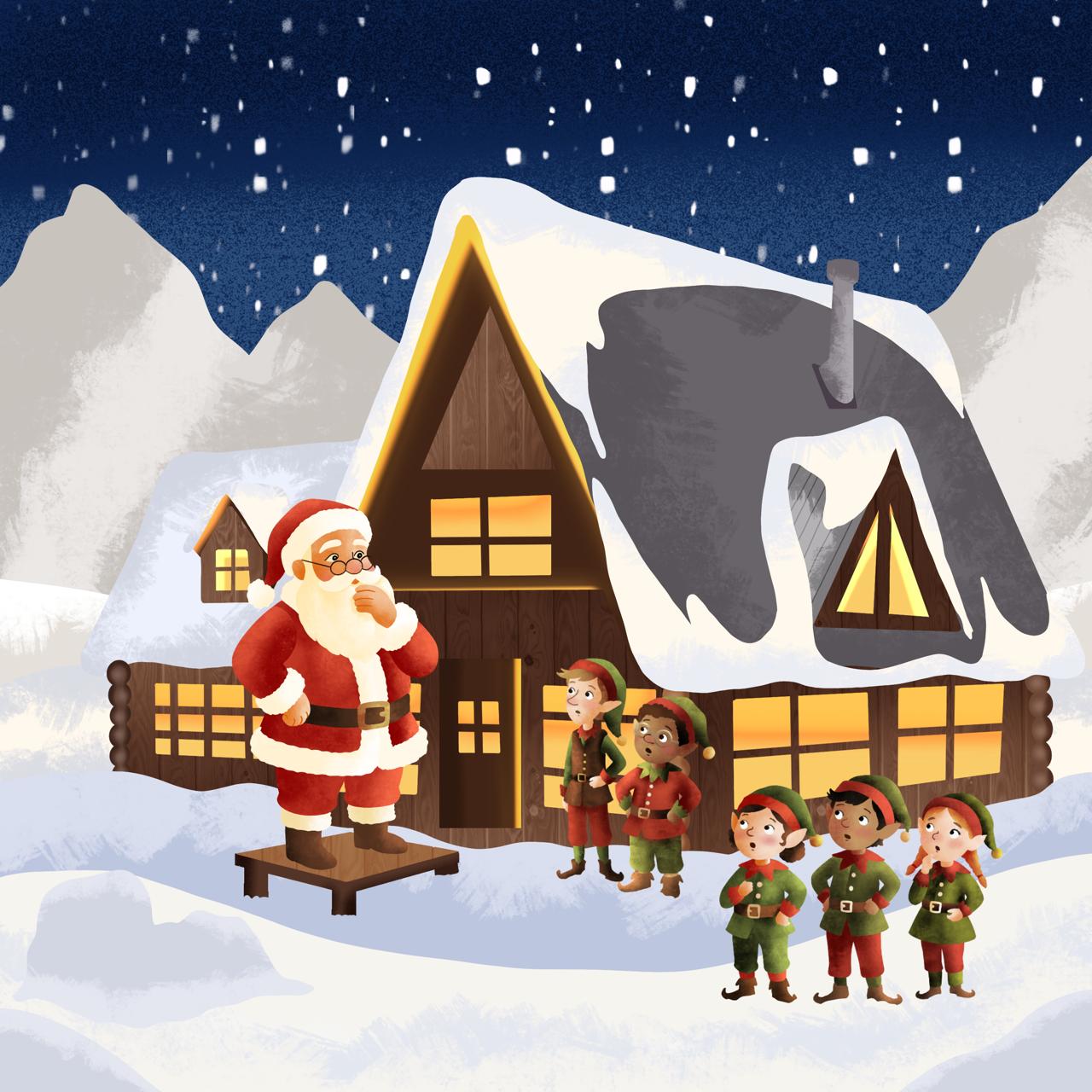 A classic winter holiday scene depicting Santa Claus addressing a group of attentive elves outside a snow-covered log cabin. This illustration illustrates strong composition, contrasting cool nighttime winter tones with...