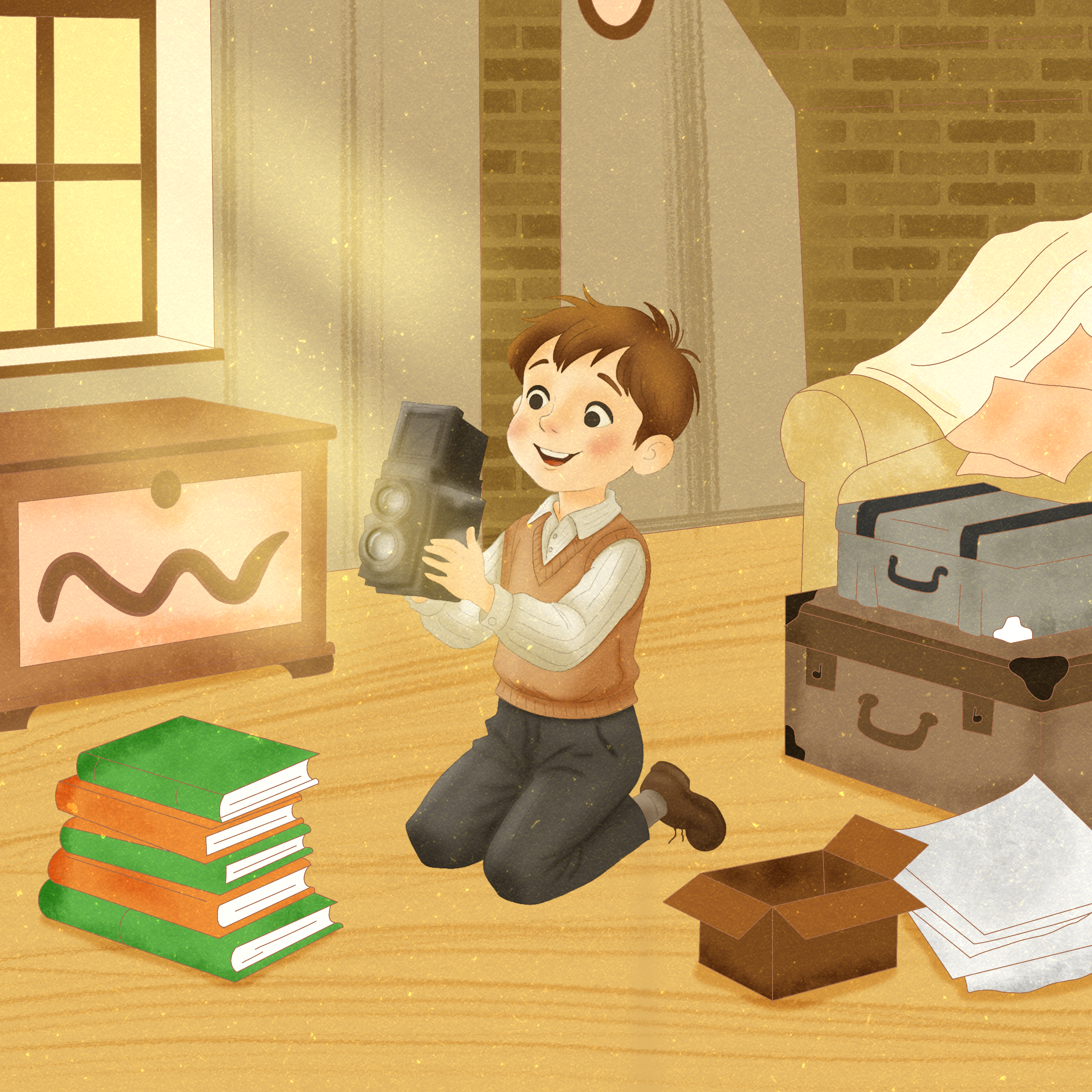 This illustration depicts a moment of curiosity and discovery as a young boy finds an interesting object in a sunlit room. Subject: A young boy with brown hair, wearing a...