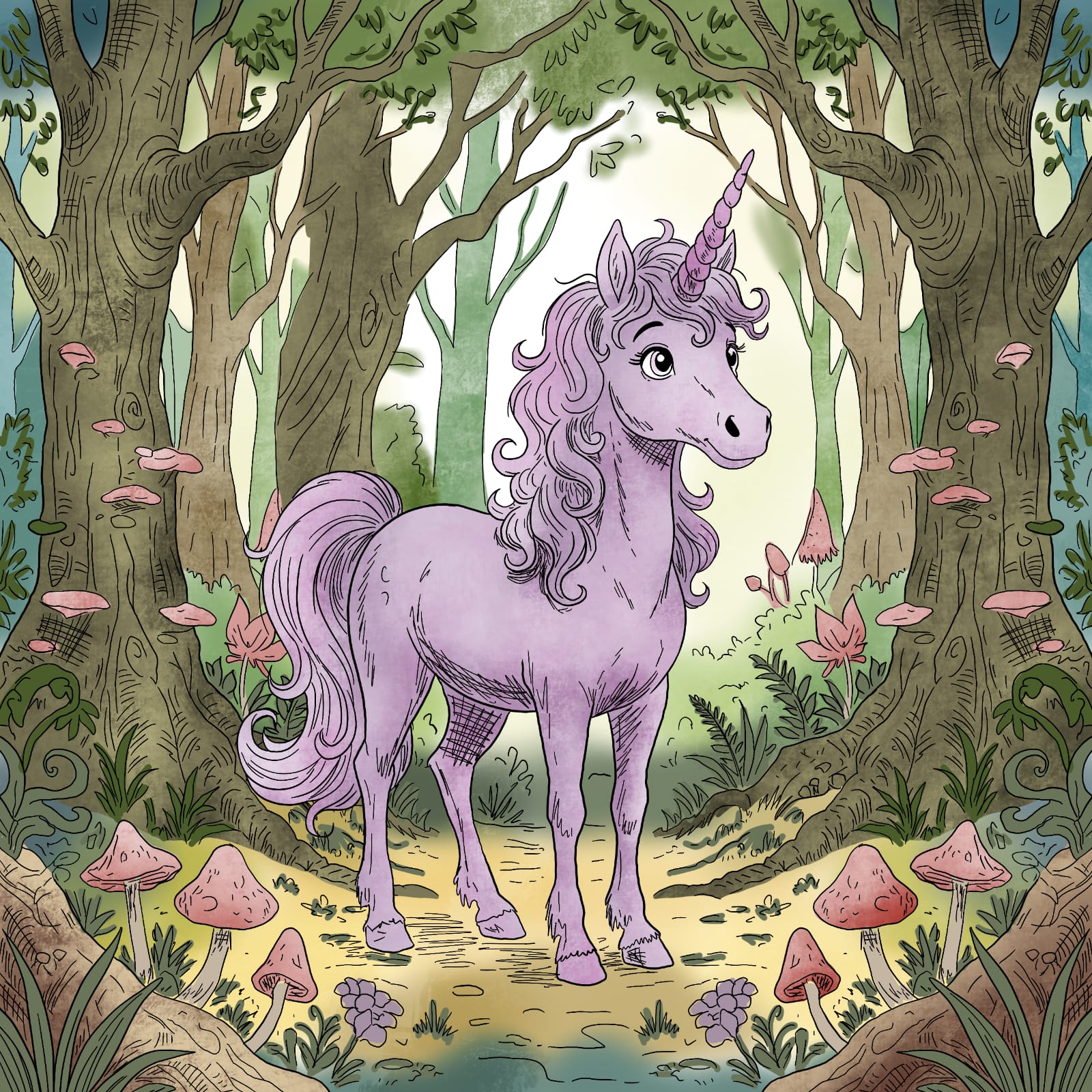 A whimsical exploration of fantasy imagery, this piece depicts a gentle unicorn wandering through a stylized, magical forest. The artwork utilizes a unique blend of soft coloring and detailed cross-hatching—particularly...