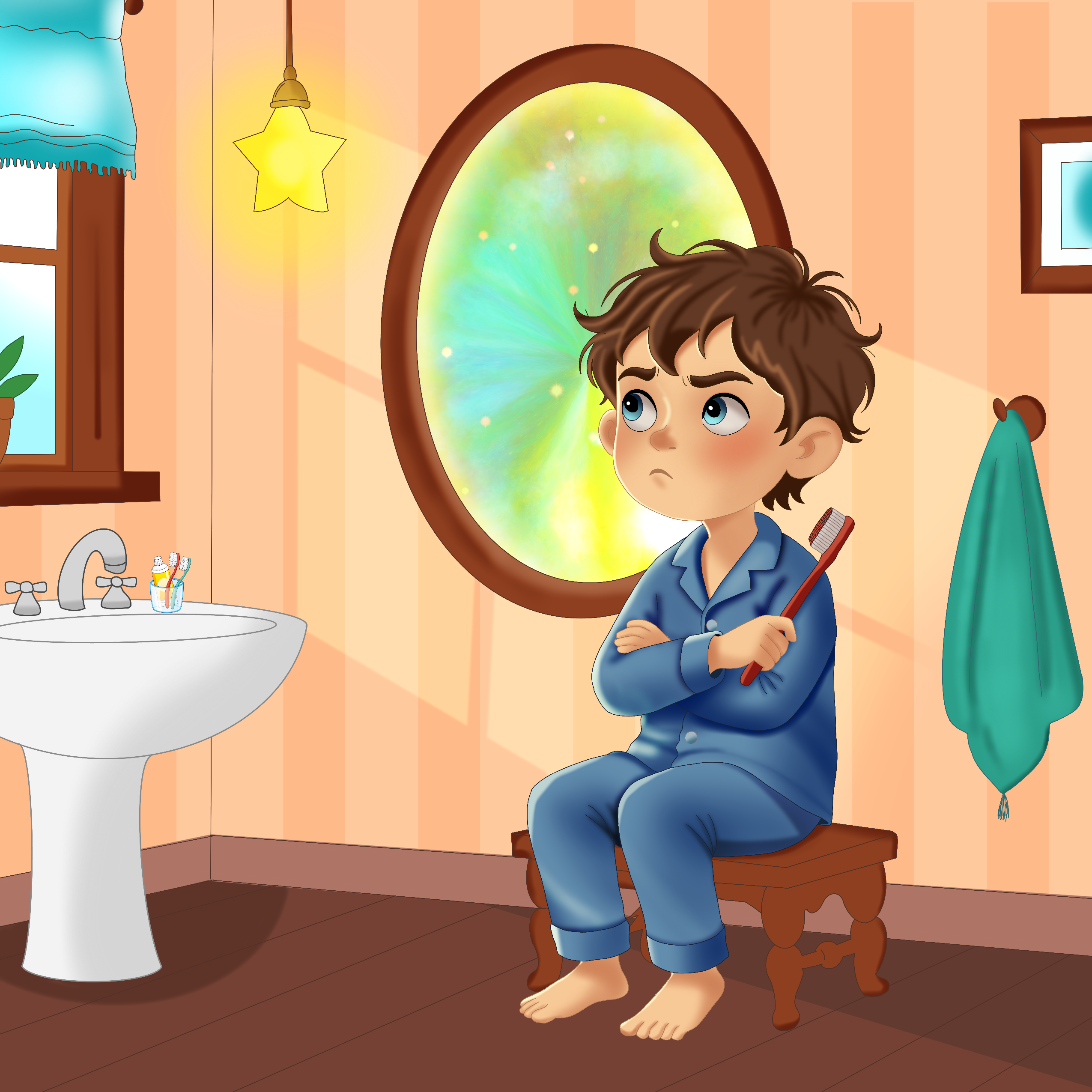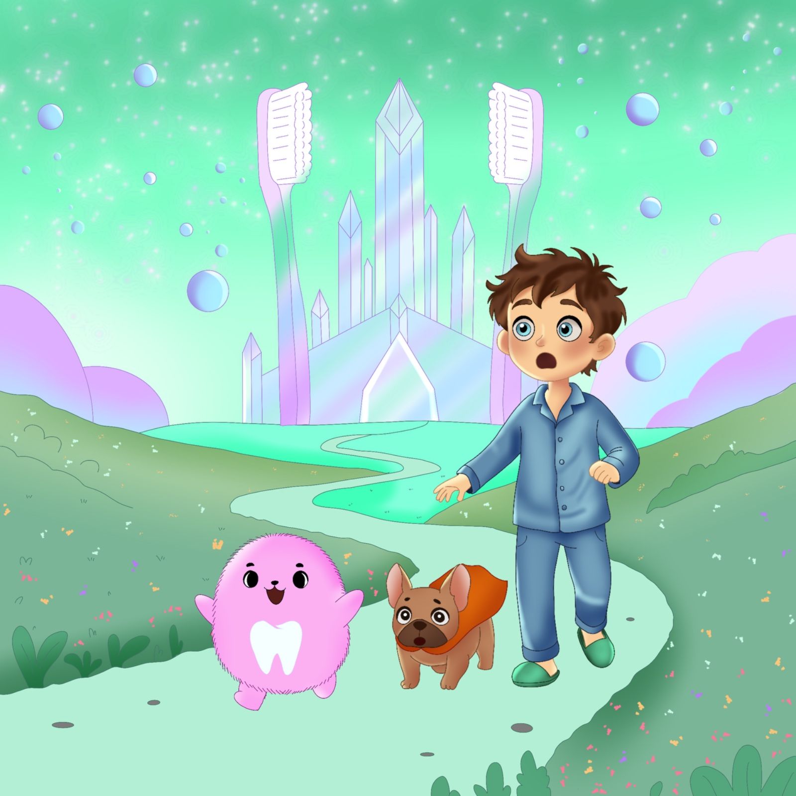 This whimsical illustration portrays a young boy exploring a magical, dental-themed fantasy world. Characters: A boy with brown hair, dressed in blue pajamas and green slippers, walks along a path...