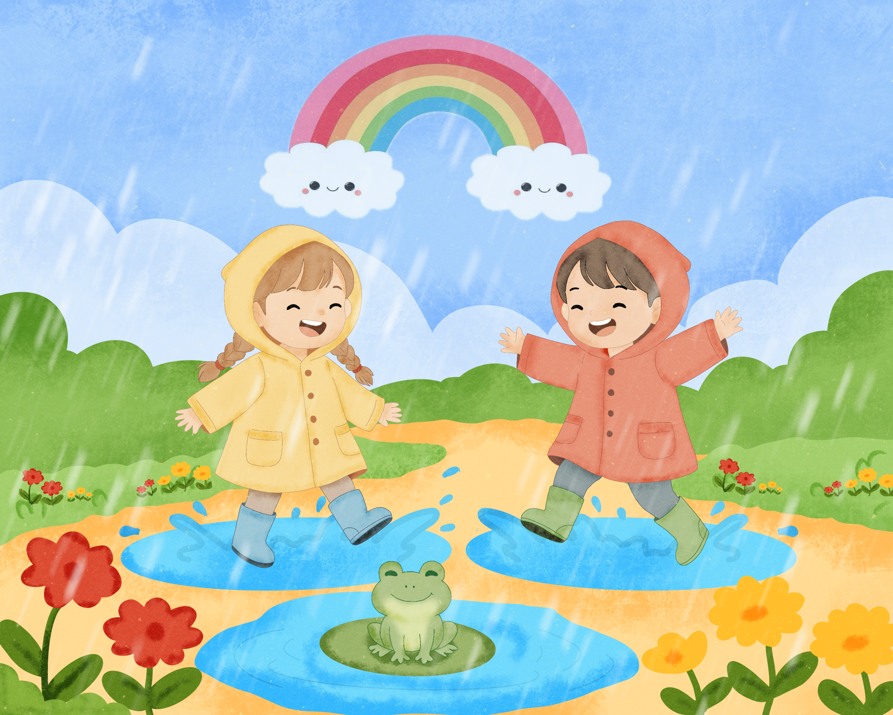 This cheerful illustration captures the pure joy of children playing in the rain, featuring bright colors and whimsical elements. Characters: Two happy children are splashing in puddles. On the left,...