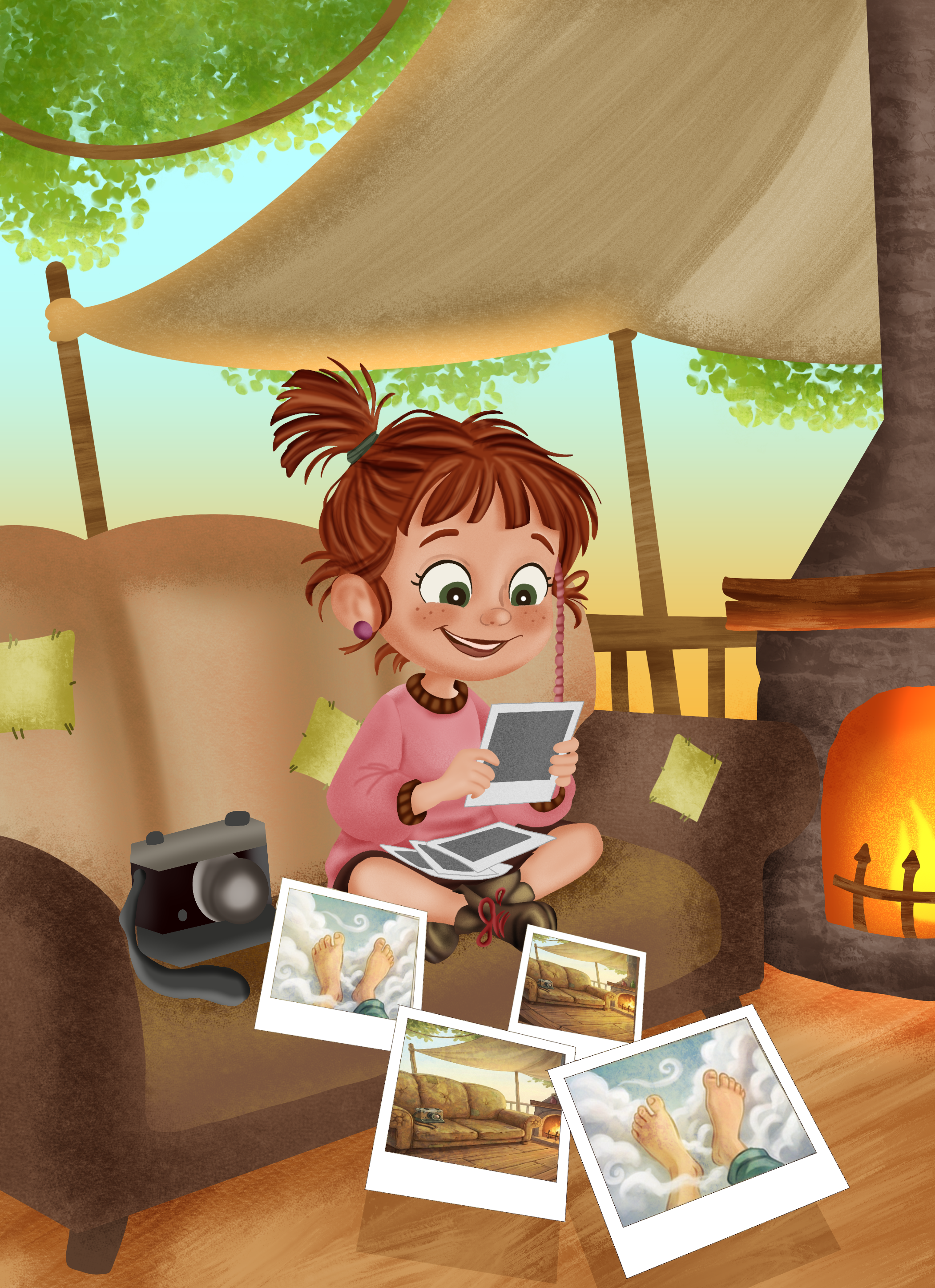 This illustration depicts a cozy and adventurous scene inside a treehouse where a young girl is reviewing her collection of photographs. Character: A young girl with reddish-brown hair tied in...