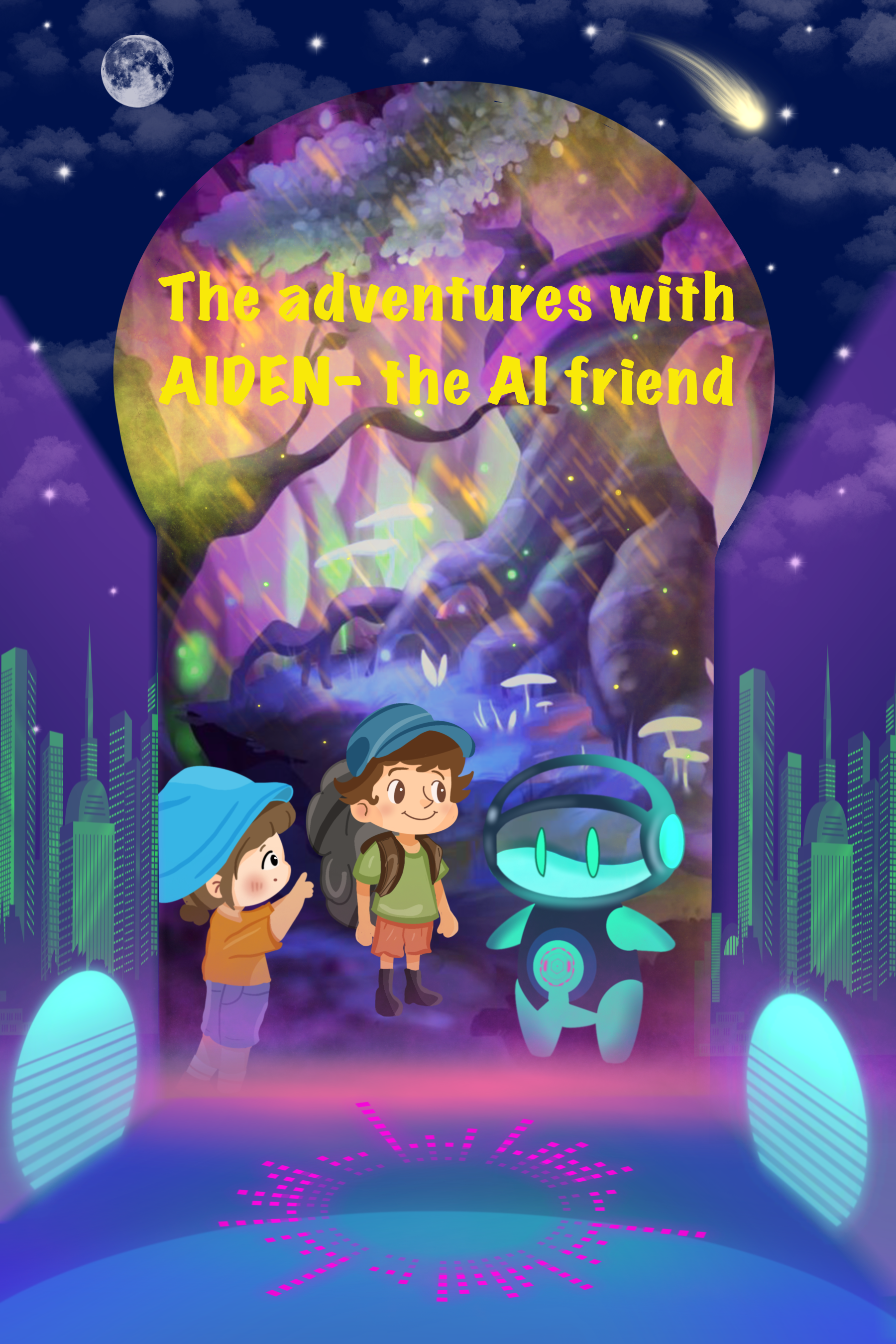 This vibrant digital illustration appears to be a book cover or poster design that blends science fiction with fantasy. Subject: The artwork features the title "The adventures with AIDEN- the...
