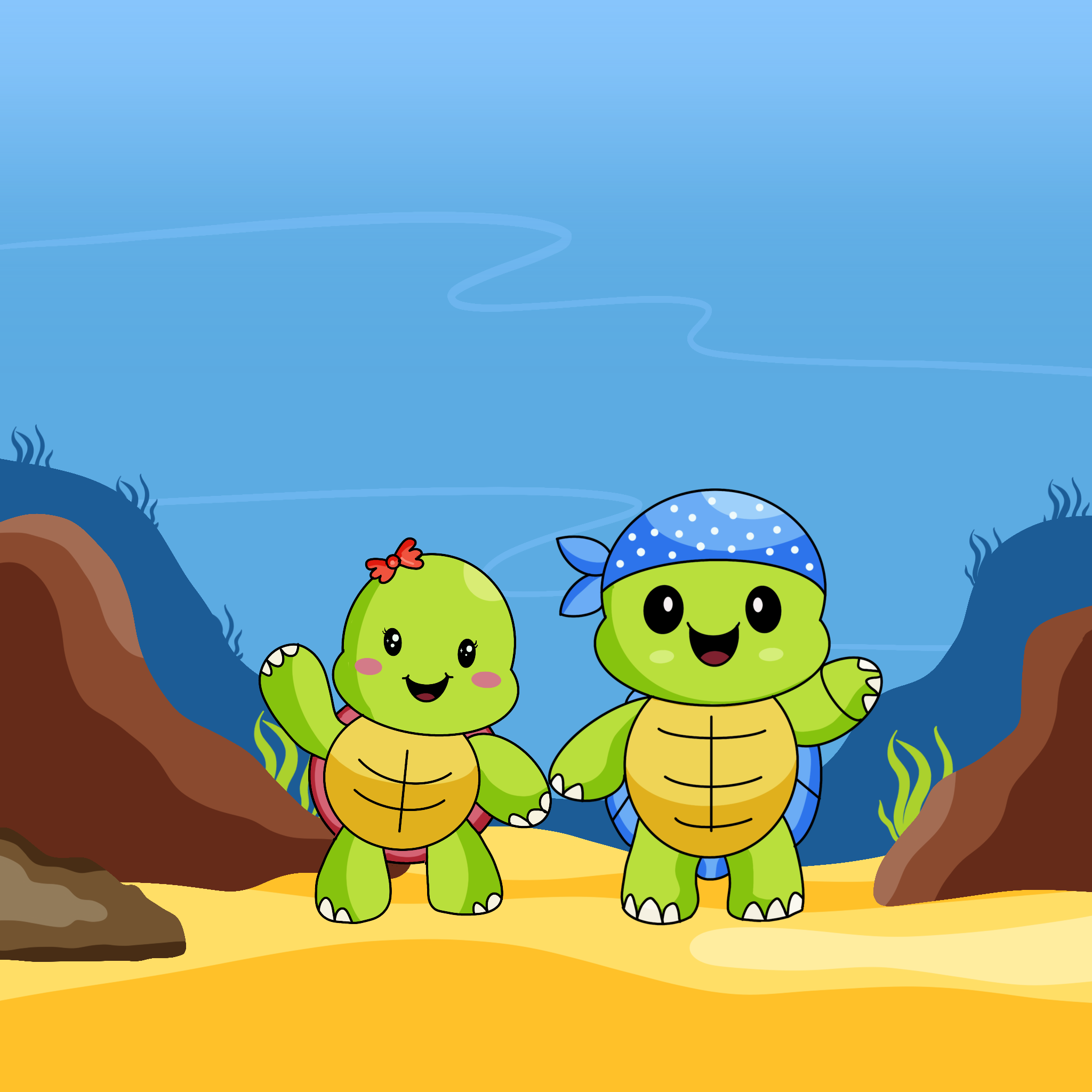 This bright and colorful digital illustration features two friendly turtles in an underwater setting. Characters: Two green anthropomorphic turtles stand side-by-side on the ocean floor, waving hello. The turtle on...