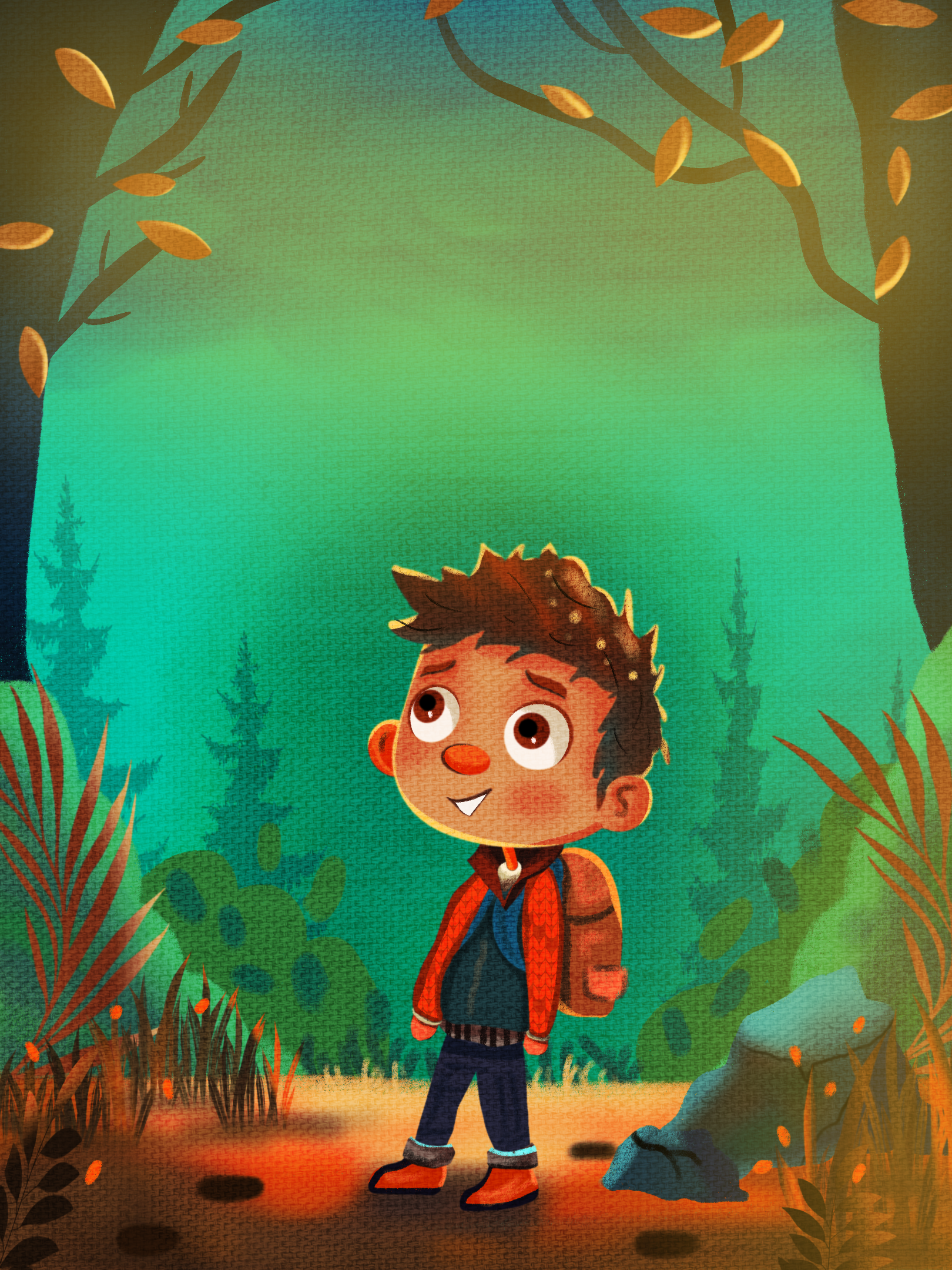 This illustration depicts a young adventurer pausing to admire the wonders of a stylized forest. Subject: A young boy with spiky brown hair stands in the center. He wears a...