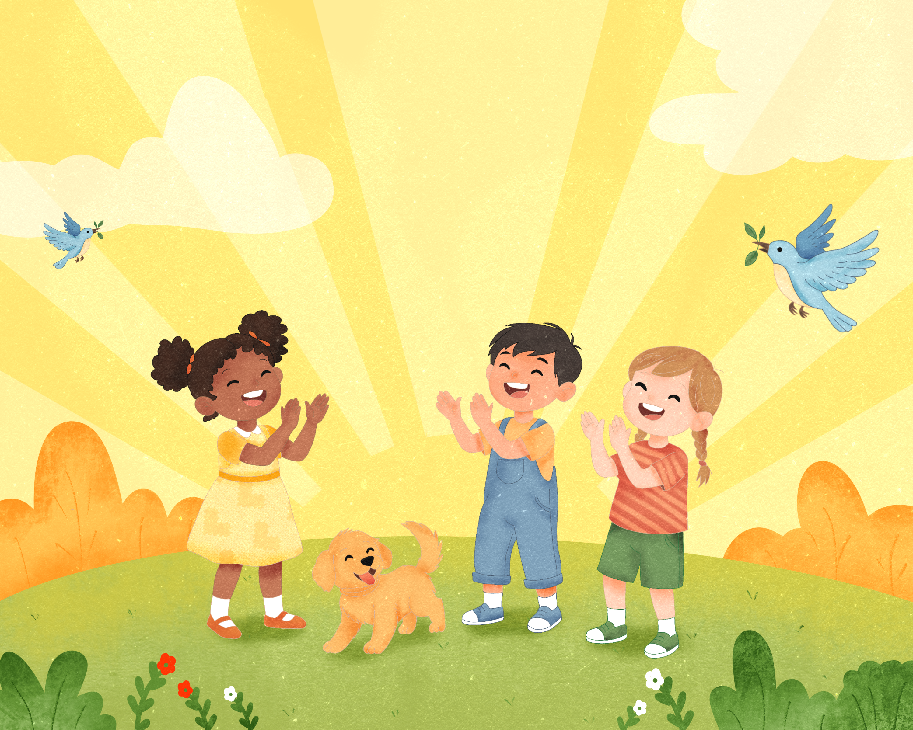This vibrant illustration captures a scene of pure happiness and celebration under a bright morning sun. Characters: A diverse group of three children stands in a grassy field. On the...
