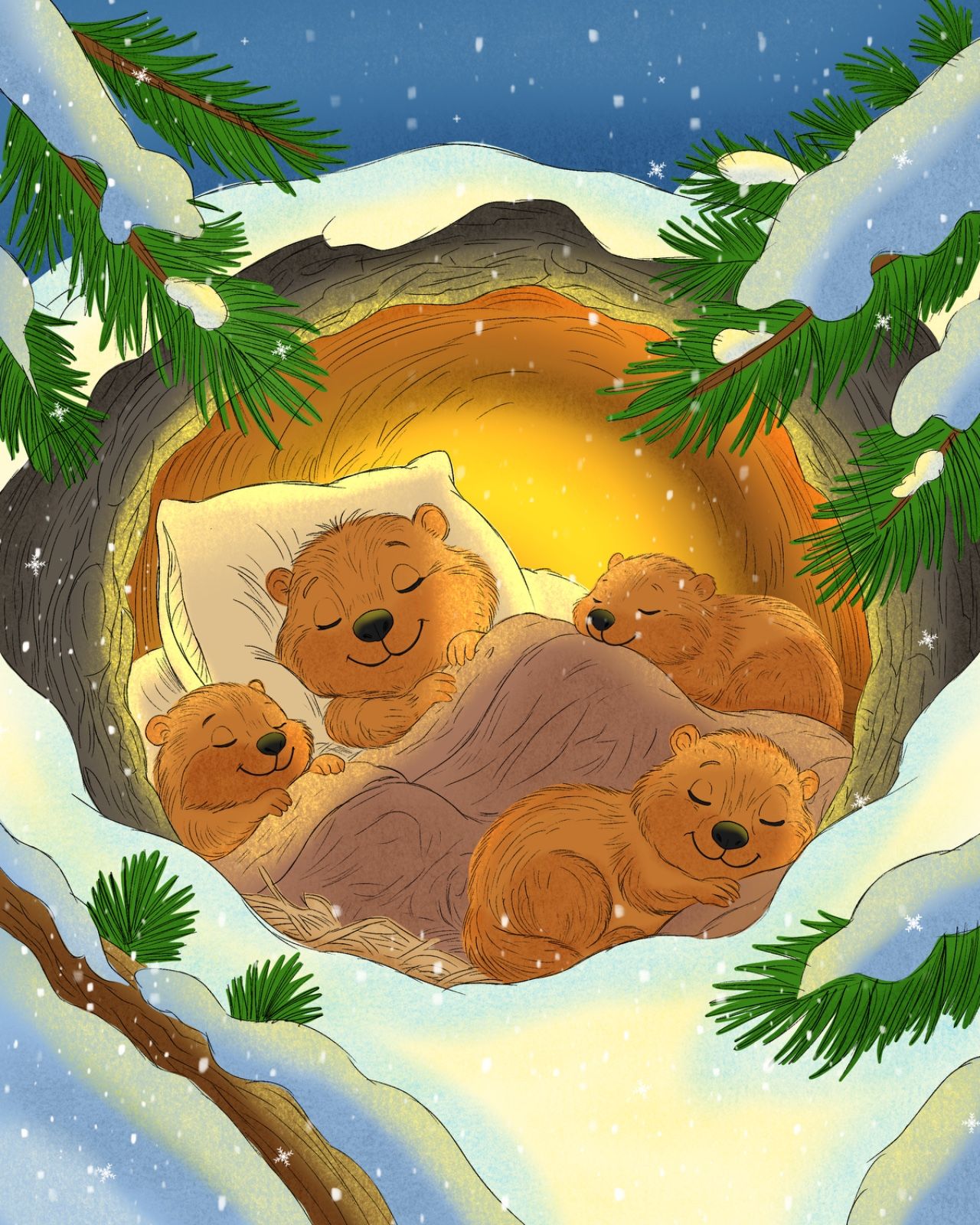 Deep in the heart of the snowy forest, the world is quiet and cold, but inside the hollow, everything is warm and safe. This digital illustration captures a cozy family...