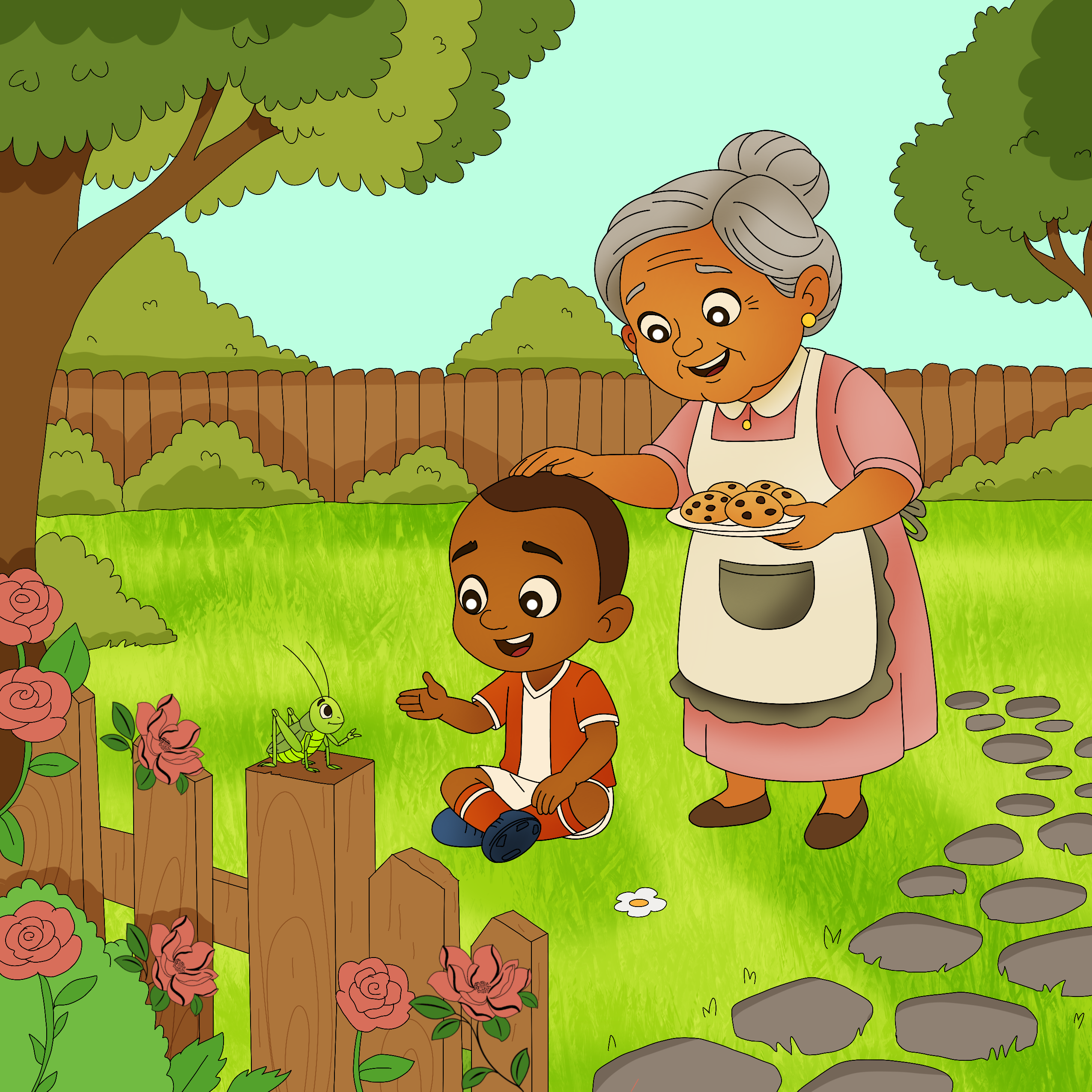 This illustration depicts a tender moment of connection between generations in a peaceful backyard setting. Characters: An elderly woman with grey hair in a bun, wearing a pink dress and...
