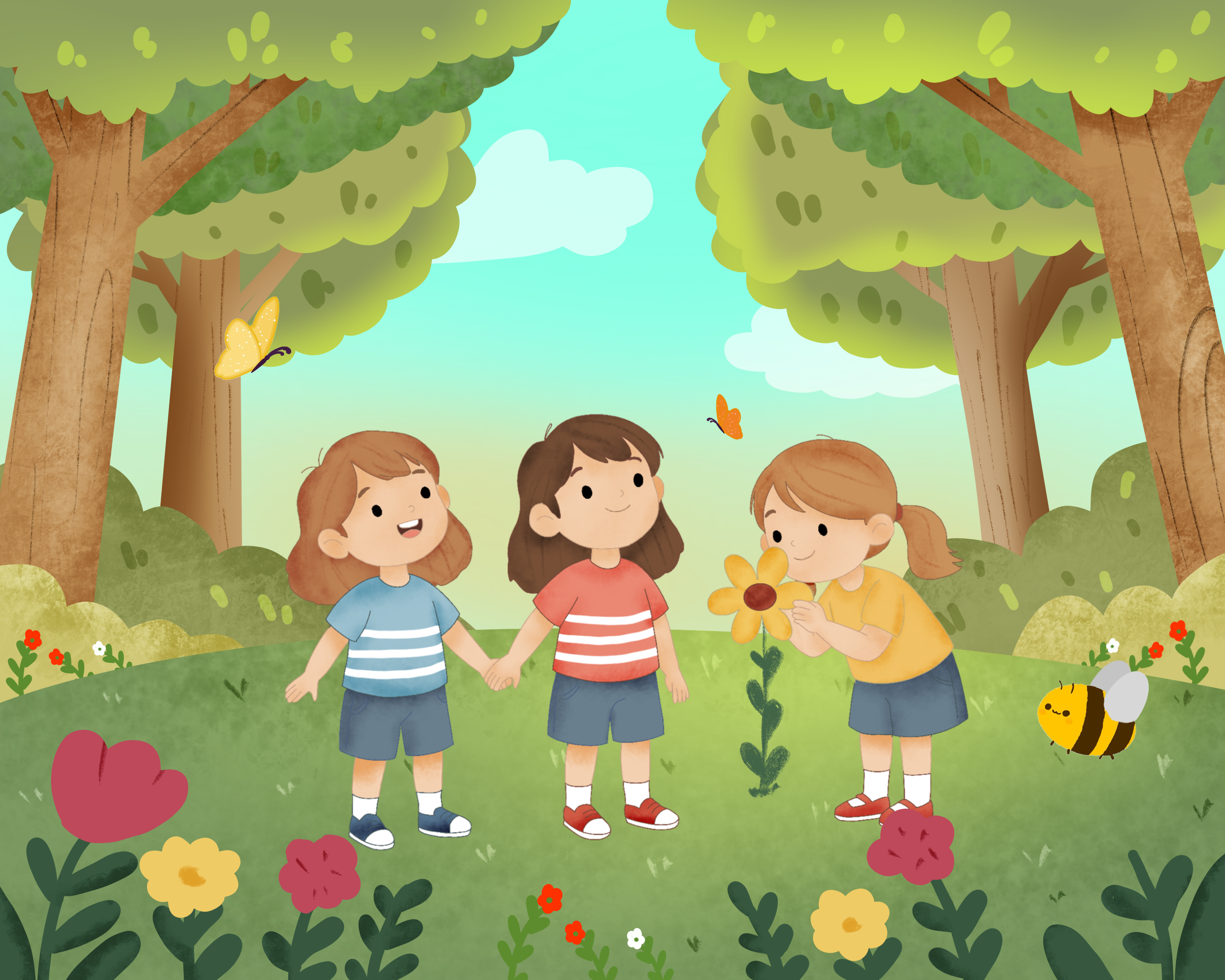 This illustration depicts a cheerful outdoor scene with three young friends enjoying nature. Characters: Three girls stand in a grassy field. Two girls on the left—one in a blue striped...